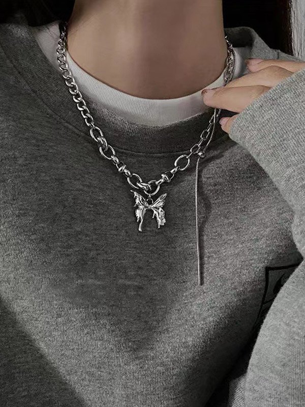 Double Layered Rhinestone Butterfly Pendant Necklace