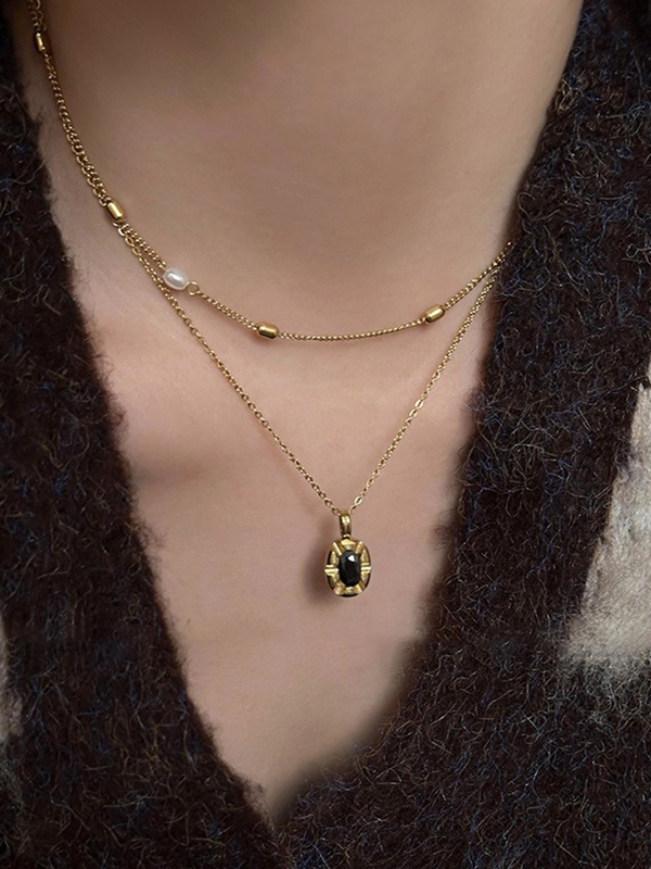 Black Zircon Pendant Pearl Stacked Design Necklace