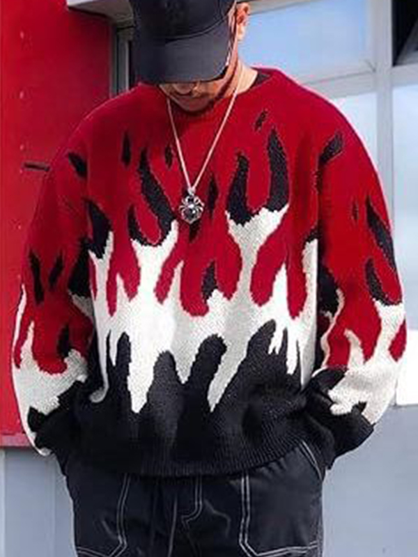 Men’s Contrast Color Flame Jacquard Crew Neck Sweater