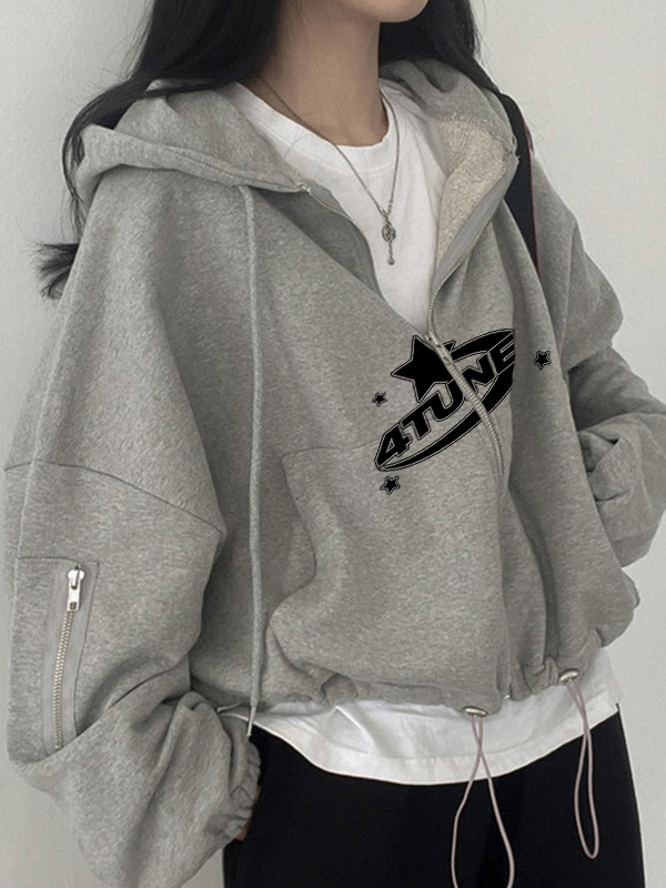 Star Letter Print Zipper Drawstring Hem Oversized Hoodie