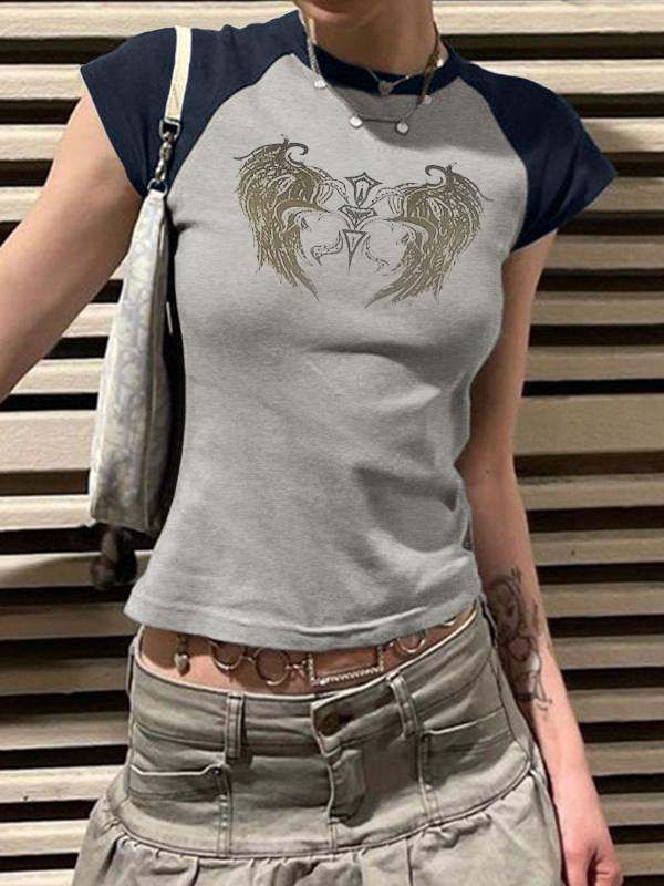 One Shoulder Fake Two Piece Print Long Sleeve Tee