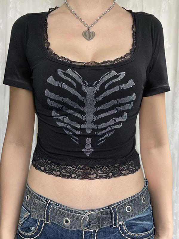 Lace Patchwork Skull Print Black Short Sleeve Tees