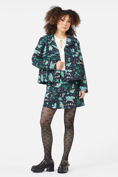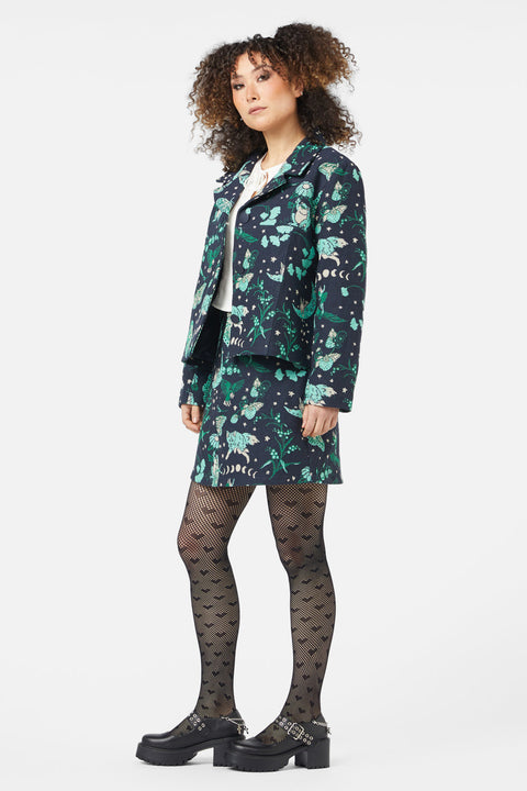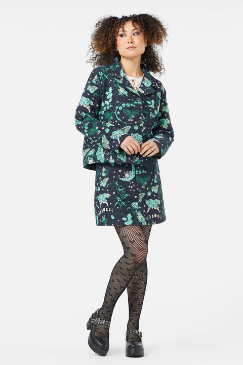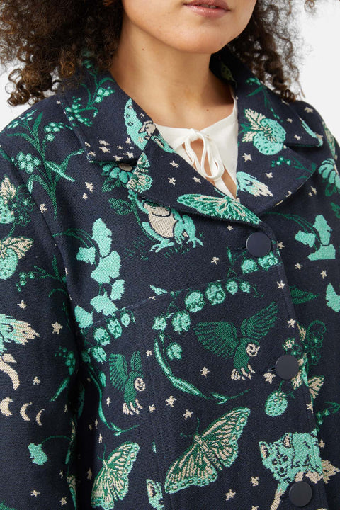 Vkročte do mystického světa s bundou Forbidden Forest, která se vyznačuje propracovaným brokátovým uměním a dodává každému outfitu jedinečný nádech. Tato bunda s hranatým střihem má tvarovaný límec a zapínání na knoflíky, což spojuje odvážný vzhled s okouzlujícím nádechem. Vyrobena z tkaného brokátu, dodává bunda texturu a hloubku, díky čemuž je výrazným kouskem. K dispozici v vícebarevném vzoru.