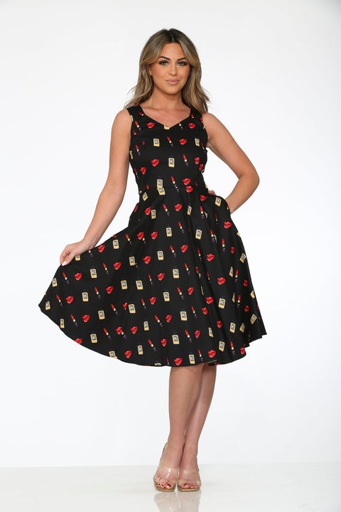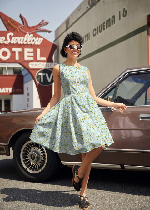 Suchen Sie ein klassisches Kleid im Vintage-Stil Unser Elizabeth-Schnitt mit all seinen Details lässt keine Wünsche offen! Dieses Baumwollkleid in unserem zarten Blumenmuster besticht durch Paspeldetails am Oberteil mit Zierknöpfen vorne, figurschmeichelnden Falten an der Taille, einem schwingenden Rock im Vintage-Stil mit versteckten Seitentaschen und einem Reißverschluss hinten.