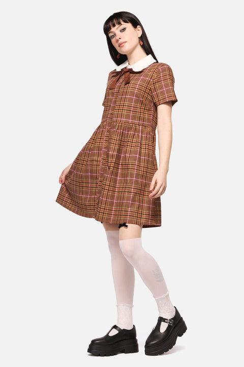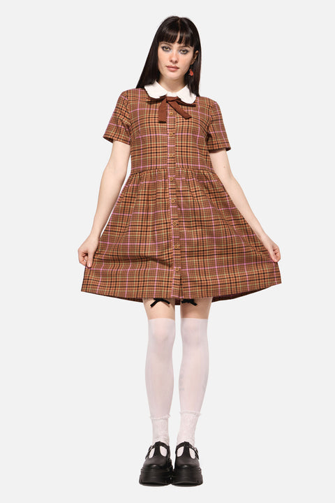 Dieses traumhafte Tartankleid ist wie geschaffen für Waldwanderer, Anhänger der Dark Academia und Vintage-Liebhaber. Mit seinem Rüschenkragen, der auffälligen Schleife und dem weiten Rock erinnert es an Feenkreise und verstaubte Bibliotheken. Natürlich, romantisch und ein wenig verzaubert.