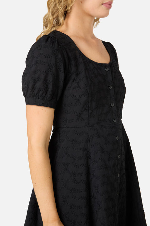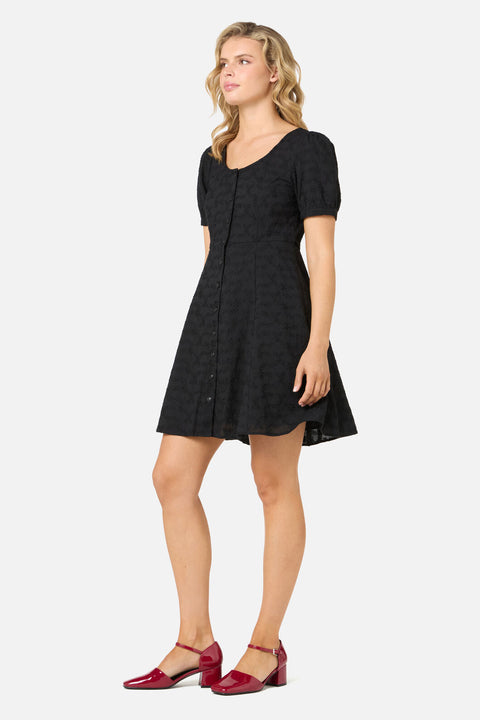 Feminin und zeitlos: Dieses schwarze Minikleid mit floraler Lochstickerei verleiht Ihrer Alltagsgarderobe einen Hauch von Vintage-Charme. Mit seinem sanft geschwungenen Ausschnitt, den Puffärmeln und dem ausgestellten Rock vereint es Romantik und Komfort perfekt.