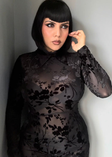 Das Kleid „Ophelia“ hat eine umwerfende Sanduhr-Silhouette… Dieses transparente, figurbetonte Maxikleid aus floralem Samt mit Ausbrennermuster ist unglaublich dehnbar und figurbetont. Es hat einen ausgestellten Meerjungfrauen-Rock und eine Schnürung am Rücken, die Ihre Taille betont. Das Kleid ist transparent, kann aber bei Bedarf problemlos mit einem schwarzen Unterkleid getragen werden. Nutzen Sie die untenstehende Größentabelle, um Ihre empfohlene Größe zu finden. Bitte beachten Sie, dass der Stoff sehr dehnbar ist. Wenn Sie zwischen zwei Größen liegen, wählen Sie die kleinere Größe für eine engere Passform oder die größere für eine lockerere. Model Molly ist 1,78 m groß und trägt Größe XS.