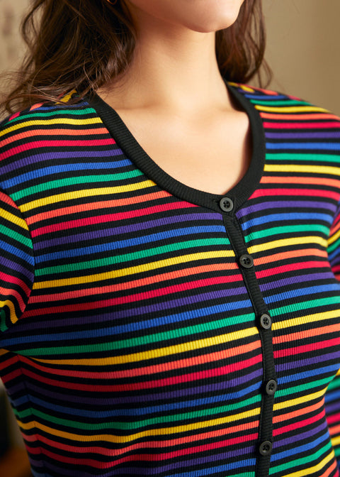 Mit diesem herrlich retro-inspirierten „Rocking ‚Round the Record Player Union Suit“ aus unserer ModCloth-Eigenmarke wird Gemütlichkeit zum absoluten Highlight. Ob Filmabend, spontane Tanzeinlagen oder einfach nur ungeniert den Lieferboten empfangen – dieser Einteiler ist wie gemacht für lange Filmabende, spontane Tanzeinlagen und bietet dir von Kopf bis Fuß dehnbaren Rippstrickkomfort. Die leuchtenden, bunten Streifen versprühen puren 70er-Jahre-Flair und lassen die Pride-Parade wieder aufleben, während kontrastierende Paspeln und eine klassische Knopfleiste für Gemütlichkeit und nostalgischen Charme sorgen. Zieh es an, leg deine Lieblingsplatte auf und entspann dich wie eine Legende.