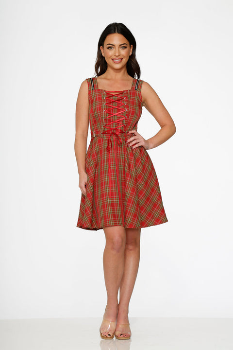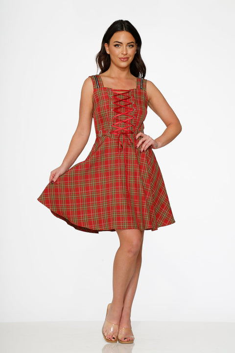 Verleihen Sie Ihrem Karo-Look mit dem roten Karokleid von Orchid Bloom einen verspielten Touch! Mit seiner Schnürung vorne, dem eckigen Ausschnitt und dem voluminösen, schwingenden Rock vereint dieses Kleid Vintage-Charme mit einem Hauch Punk-Rock. Der Baumwollmischstoff sorgt für hohen Tragekomfort – egal ob auf einem Herbstfest oder einfach nur, um sich an einem Dienstag besonders wohlzufühlen.