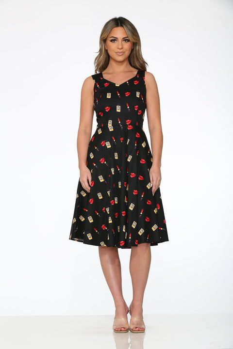 Auffällig, verspielt und einfach unwiderstehlich – das Orchid Bloom Black Lipstick Swing Dress ist wie geschaffen für einen echten Hingucker. Mit seinem Allover-Print in rotem Lippenstift und der schmeichelhaften A-Linien-Silhouette verleiht dieses Kleid Ihrer Retro-Garderobe einen koketten Touch. Gefertigt aus einem weichen, dehnbaren Baumwollmix, ist es ebenso bequem wie ein echter Blickfang.