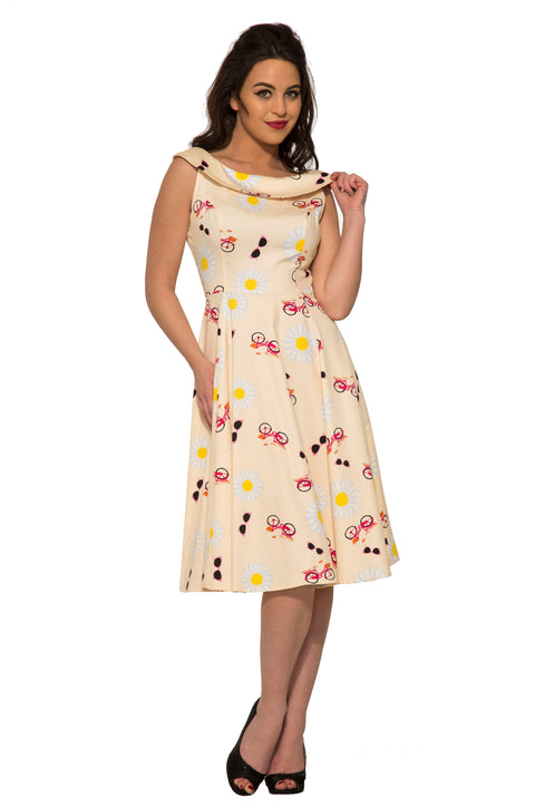 Verschönern Sie Ihren Tag mit dem verspielten Charme des Orchid Bloom Sunnyside Lane Swingkleids. Mit seinem fröhlichen Print aus Gänseblümchen und Vintage-Fahrrädern auf zartem Cremeton versprüht dieses Kleid verspielte Retro-Vibes – perfekt für Sommerausflüge und sonnige Picknicks. Der sanft fallende Wasserfallausschnitt verleiht dem Kleid einen Hauch von Eleganz, während die schwingende Silhouette jede Kurve vorteilhaft betont. Gefertigt aus einer Baumwoll-Elasthan-Mischung für optimalen Tragekomfort und mit einem seitlichen Reißverschluss für eine nahtlose Passform.