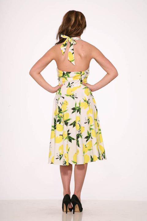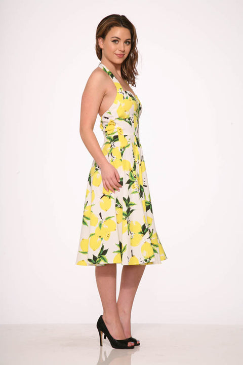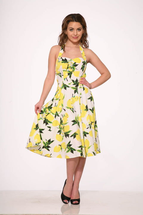 Wenn dir das Leben Zitronen gibt – trag sie! Das weiße Zitronen-Halterkleid von Orchid Bloom ist ein spritziges, vom Vintage-Stil inspiriertes Traumkleid mit einem frischen Zitronenprint auf strahlend weißem Grund. Dank des schmeichelhaften Neckholder-Ausschnitts und des weit schwingenden Rocks bringt dieses Kleid bei jeder Drehung einen Hauch von Sonnenschein in dein Leben. Die Baumwoll-Elasthan-Mischung sorgt für eine bequeme und angenehme Passform – perfekt für Picknicks, Partys oder einfach, um dir den Tag zu verschönern.