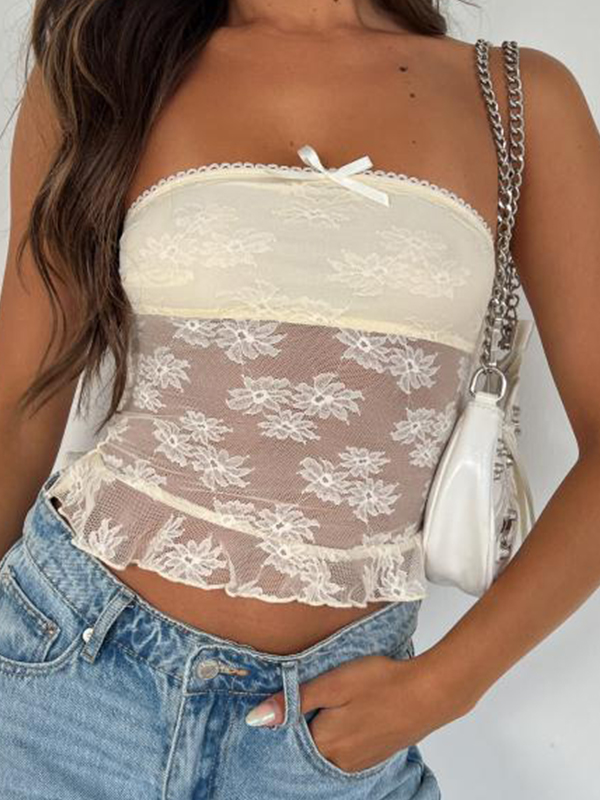 Lace Mesh Splice Lettuce Hem Bandeau Top