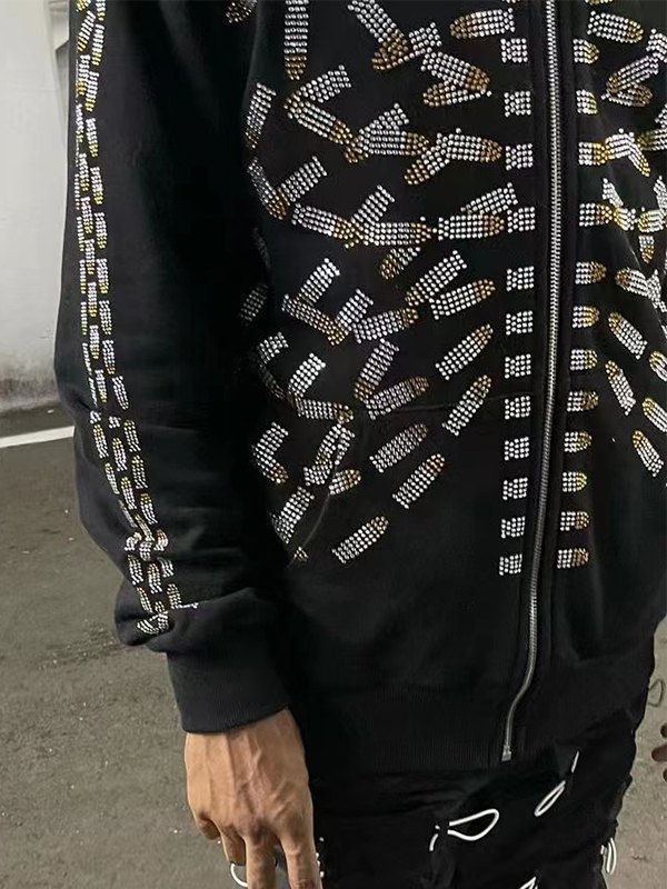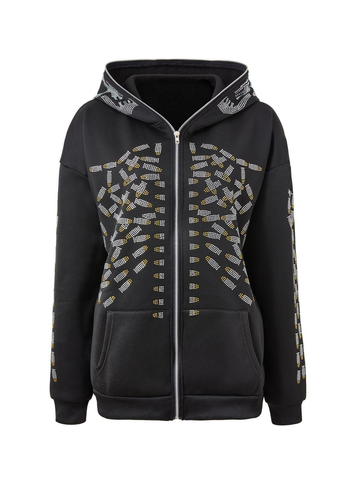 Description: These chic high street punk-inspired hoodies cut to a relax silhouette, designed with rhinestone skull pattern to the front, features dropped long sleeves, front pockets and zip fasten detailing.