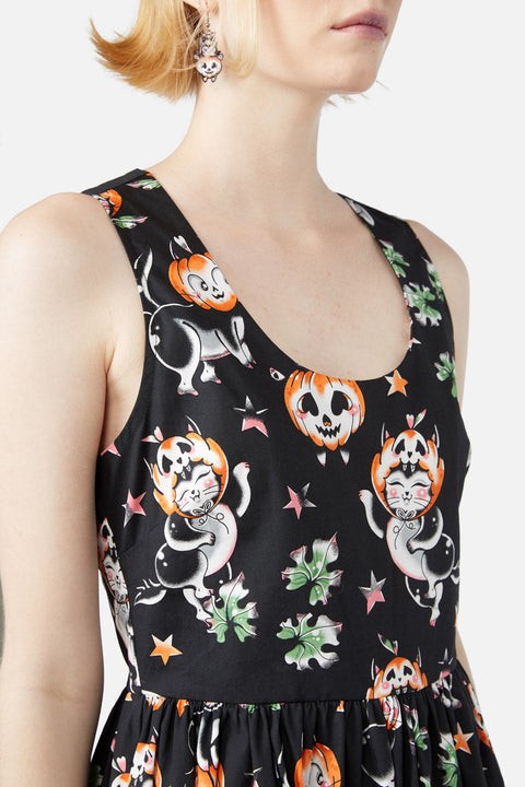 Dodejte svému šatníku špetku strašidelného kouzla s šaty s potiskem dýňového potisku! Tyto šaty s přiléhavým střihem a rozšířenou sukní se vyznačují rozkošným potiskem „Dýňový potisk“, okouzlujícím uměleckým dílem vytvořeným ve spolupráci s umělkyní Ellou Mobbs. Díky přiléhavému živůtku a rozšířené sukni lichotí vaší postavě a zároveň nabízejí hravý a rozmarný styl. Kulatý výstřih a střih bez rukávů jsou ideální pro vrstvení nebo samostatné nošení, zatímco skryté kapsy v bočních švech dodávají nádech praktičnosti.