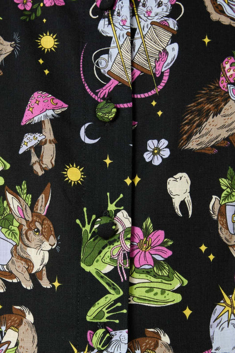 Rukávy s krátkým rukávem, zapínání na knoflíky a kapsy na sukni dodávají šatům kouzlo i funkčnost, zatímco tkaná bavlněná tkanina zajišťuje pohodlí a prodyšnost. Ať už hledáte kuriozity, nebo jen přitahujete pozornost, tyto šaty jsou jedničkou do vaší kolekce.