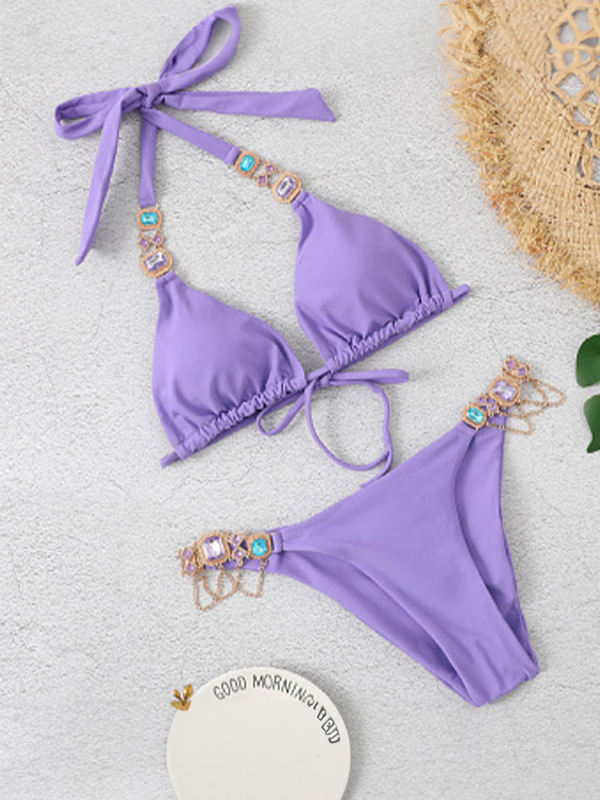 Be the first to review “Solid Gem Engraved Halter Tie Back Bikinis”
