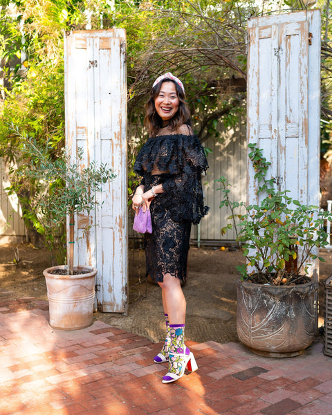Naše průsvitná ponožka Stain Glass s květinovým vzorem, inspirovaná filmem Kráska a zvíře, se vyznačuje fialovými, žlutými a modrými květinovými vzory spolu s abstraktními růžovými kousky, které vytvářejí iluzi vitráže. Je zakončena fialovým podpatkem, špičkou a manžetou pro dokonalý nádech elegance a ženskosti.