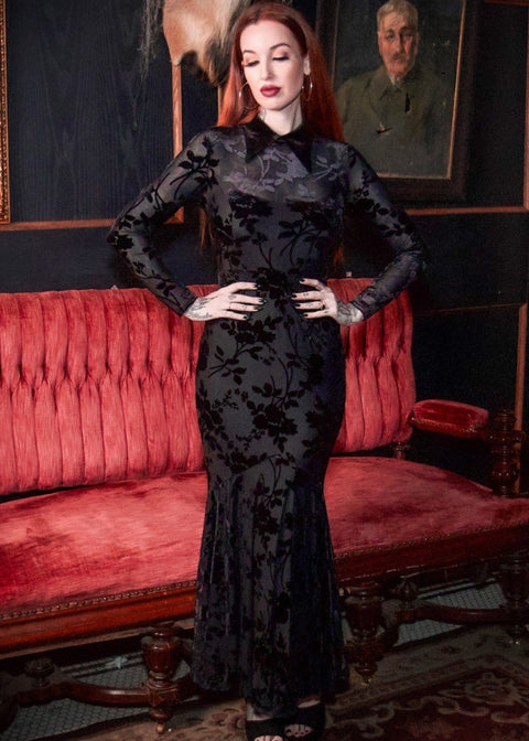 Ophelia – Samtbesetztes, beflocktes Maxikleid im Meerjungfrauenstil mit Schnürung
