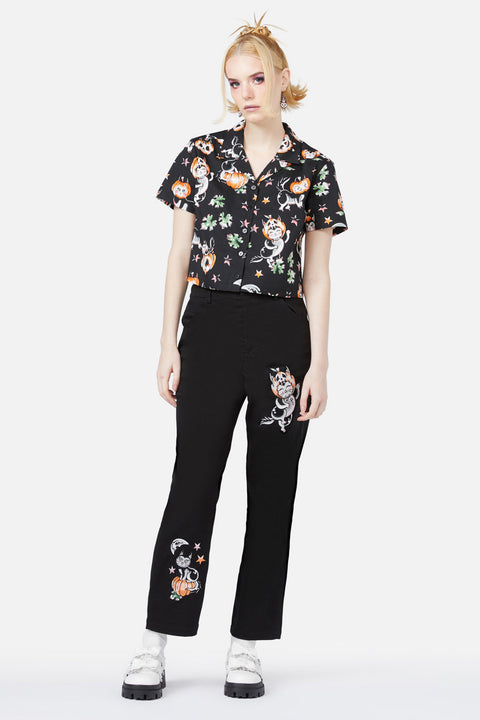 Halenka s potiskem dýňového nápisu s potiskem vdechuje do vašeho šatníku originální nádech. S celoplošným potiskem „Pumpkin Patch Kitty“, vytvořeným ve spolupráci s umělkyní Ellou Mobbs, je tato halenka rozmarnou směsicí zábavy a módy. S krátkými rukávy a klasickým límcem, zapínáním na knoflíky vpředu a zkrácenou délkou dodává halence moderní nádech. Volný střih usnadňuje styling pro ležérní dny i hravé večery.
